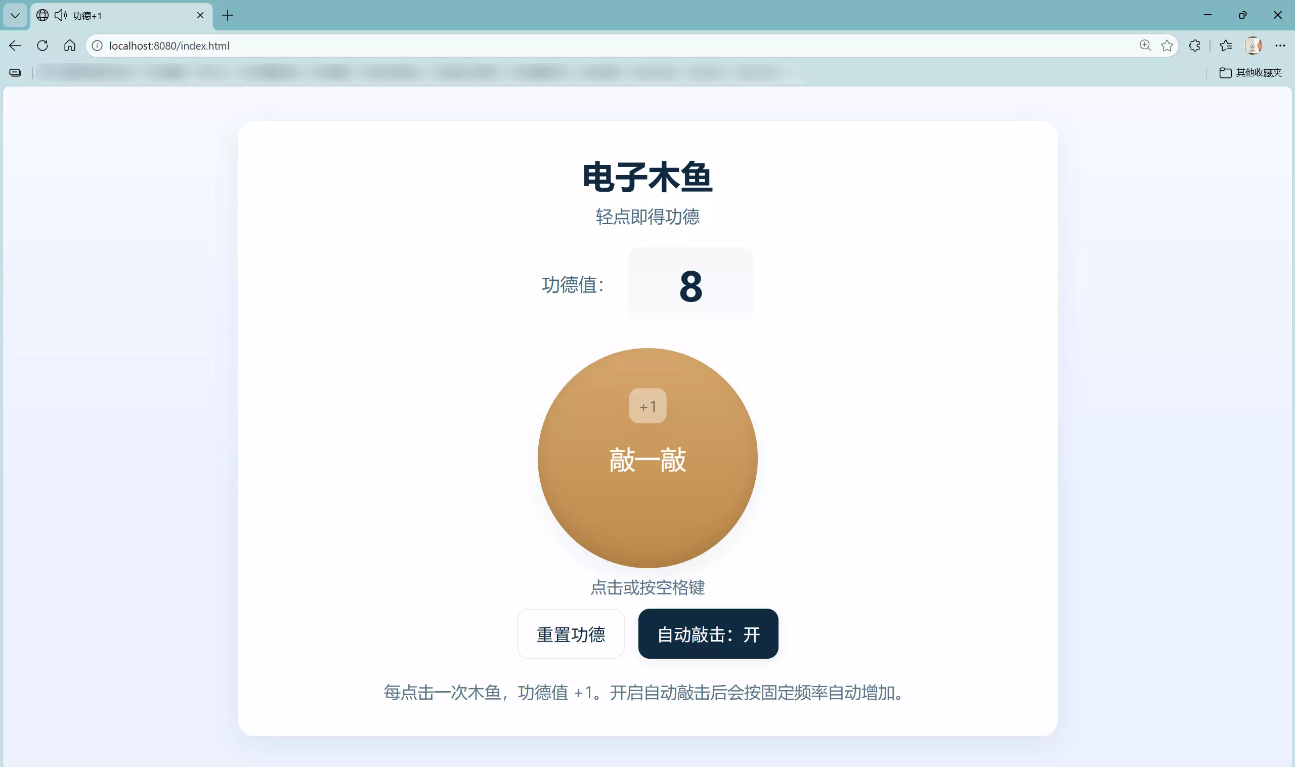 主线程用epoll这种多路复用机制监听客户端连接,当有read或者write事件发出请求时,将请求加入到线程池,线程池中的一个线程争抢到锁,开始执行任务,任务包括解析请求与生成响应,包括对信号的序列化与反序列化,最终发布的静态资源为js页面,这里简单让ai写了一个电子木鱼的效果并进行一些润色,系统适配Linux。